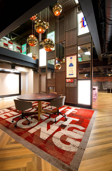 With over 7,500sqft of amazing amenity space for the students, referred to as the ‘Hub’, it’s no wonder the scheme is phenomenally popular with the students. The Hub area is spread over two floors, ground floor and the basement level, which Fuse felt needed to be visually connected for the space to function at its best. This led to the proposal to create two new massive 13.5sqm openings in the ground floor itself from which two storey high timber feature walls link the two levels. The timber wrap then continues along the ceiling for a further 12m. As you enter the building through the new entrance the two timber feature walls, housing graphical prints and flat LED lighting panels, are the prominent design pieces within the space. Bespoke cascading lights further draw the eye down to the basement level hub space.