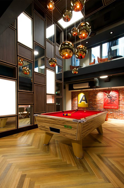The students have various areas within the hub space to study through specifically designed quiet seating areas, high work benches or at the large circular meeting tables. All of these areas along with the additional facilities of the gym, laundry, pool and table tennis tables, gaming lounges, a kitchen and show flat are designed to feel like they have their own space within the overall hub area through the design and layout of the floor finishes, dropped ceilings and the use of key pieces of furniture.