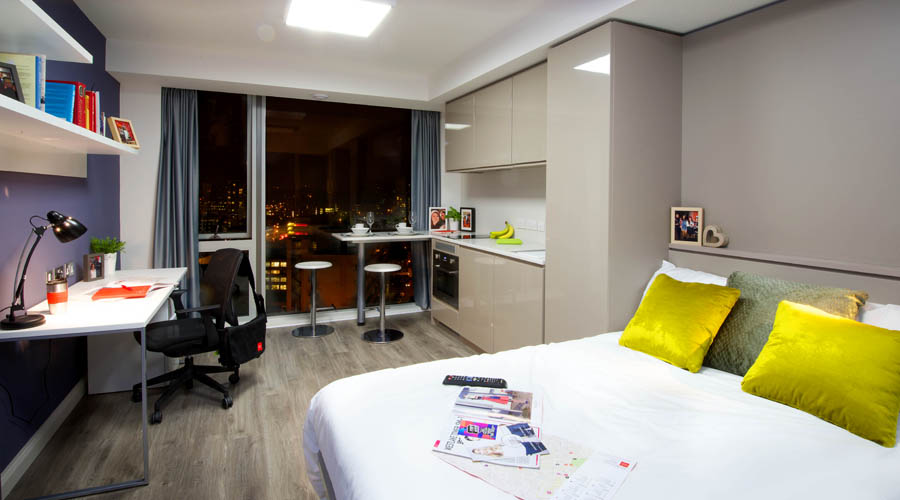 Spacious studios with their floor to ceiling glazed walls are afforded amazing views over the City of Sheffield and beyond to the Peak District. Within the studios themselves an individual breakfast bar was an additional feature that has been developed since the Southampton project, offering the students more worktop space at which to eat or work.