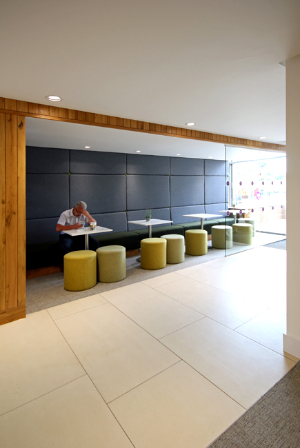 The whole area is designed to be easy on the eye with plenty of natural timber and the use of subdued colours and because of the seating options, it works equally well as a space for a quick coffee, a meal or an informal business meeting. The high-backed seats in the booths provide comfort but also make a vital contribution to the acoustic properties of the space – creating a pleasantly quiet environment, yet one in which private conversations are not overheard by others.