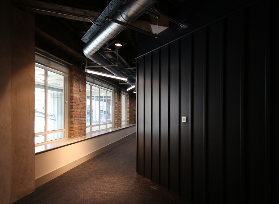 By contrast, the wall of the meeting rooms opposite has been clad in dark grey timber, broken up with simple vertical battens which continue across the doors. As elsewhere, the corridor ceiling is the exposed soffit of the floor above with exposed services. Lighting is provided by a zig-zag of LED Encapsulite fittings with the occasional Hacel fitting to provide hot spots. Flooring is with Bolon carpet to improve the acoustics of the space.