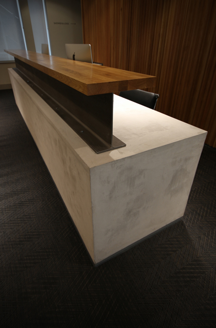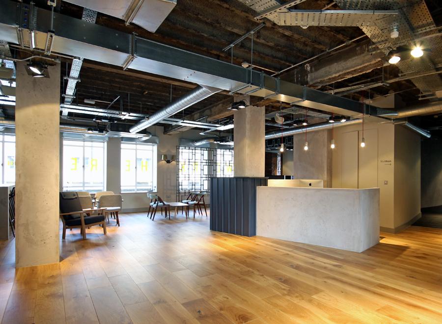 The first floor houses the Club Room and Work Room which are at the centre of The Office Group scheme – both physically and culturally. The reception counter (right) was relocated to the centre of the building to allow dual aspect views to the front and rear of the building so that, upon entry, the space feels deeper than it actually is. The counter is simplicity itself, just a concrete block with no additional ornament.