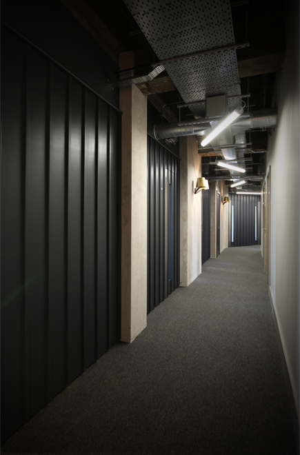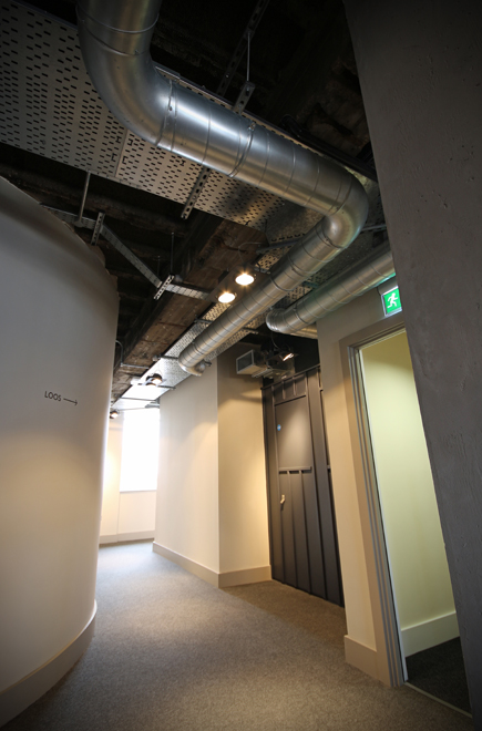 The tenants’ offices are at fourth, fifth and sixth floor and vary in size from four person to 8 person though they can be combined to make much larger spaces. All are individually climate controlled and enjoy views out across the city rooftops. Desks are arranged perpendicular to the façade such that everyone has an exterior view. Here, solid ceilings have been introduced to many areas but the services remain exposed below the ceilings. Where possible, the external walls have been left unfinished with galvanised trunking used to distribute data and power. Only the most severely damaged fabric has been covered.