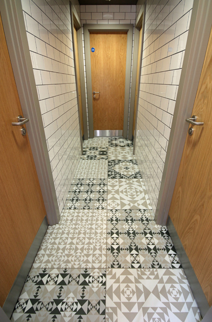 Oak floors lie under exposed ceiling soffits and services. Where internal columns had to be covered, they were given a concrete finish to match the counters. The furniture is an eclectic mix with a range of wood and upholstery finishes with a very muted palette of colours. The toilets also use the white glazed tiling, installed in brick bond pattern and contrast these against a collage of unglazed, patterned floor tiles.