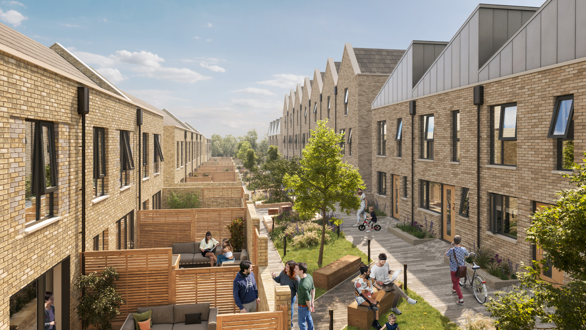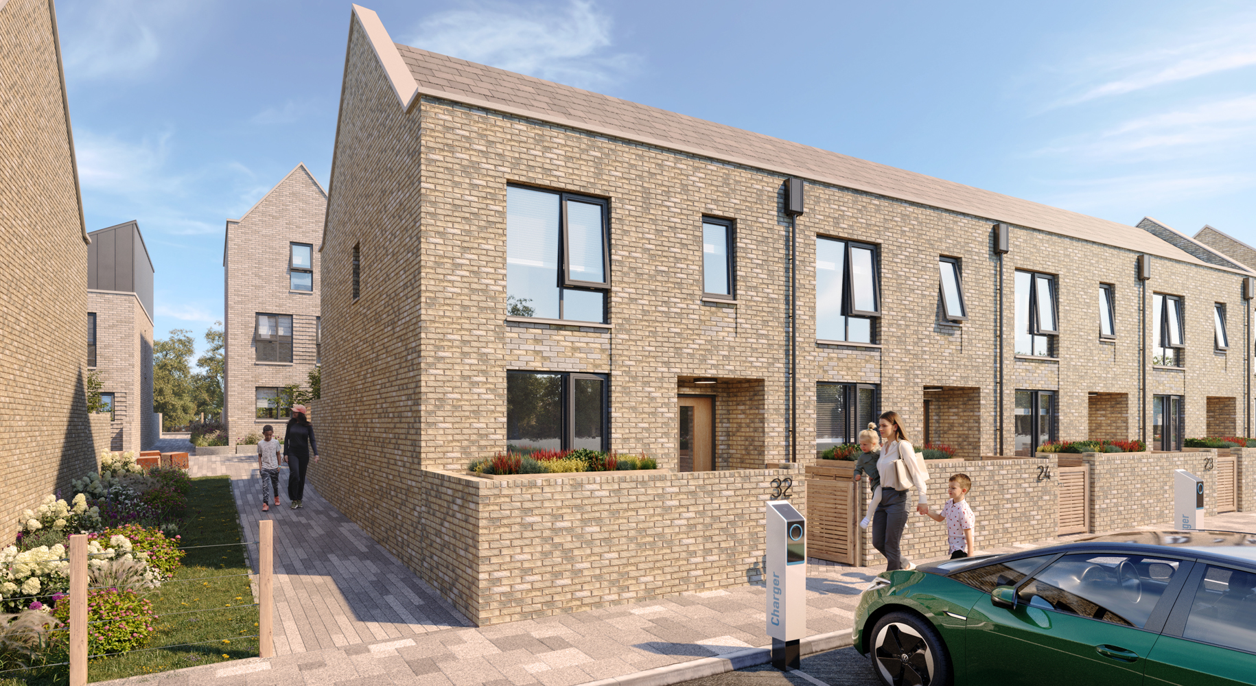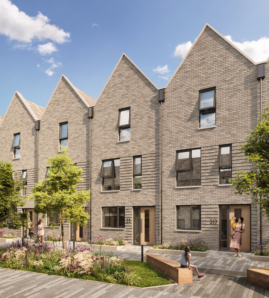 This scheme will provide 32 high quality residential homes designed around a shared ‘garden street’. This green space will provide the residents an opportunity to relax, play and interact socially with their new community. All the homes have individual gardens and parking spaces with electric charging points. The homes are grouped together in a series of terraces with the majority being designed as two storeys apart from one central terrace which is designed over three floors.