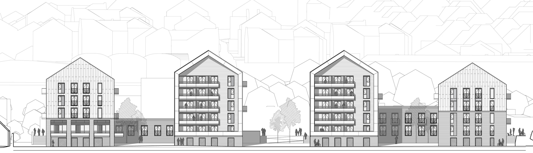 The massing approach to the site has been developed following site visits, studying the local context and building typology. The scheme requires a certain quantum of development to make it viable and out of this the massing starts to develop.
