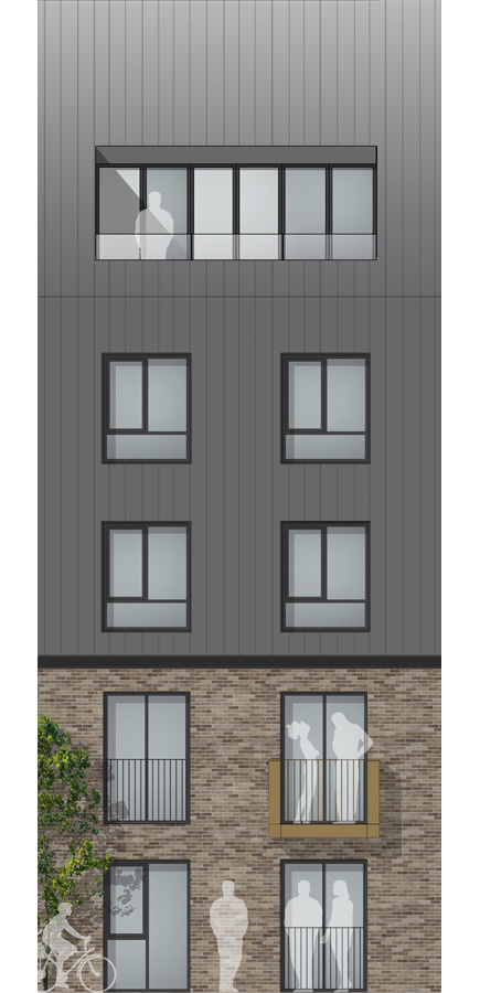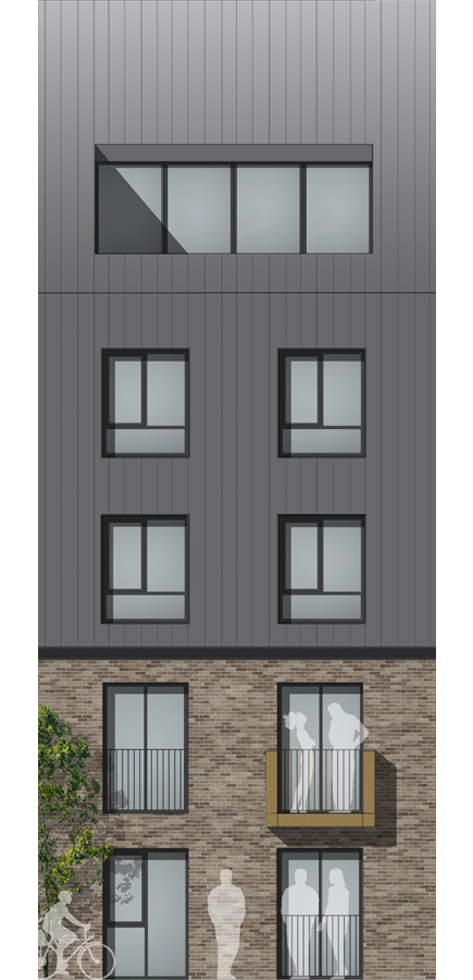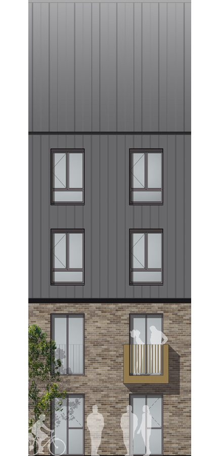 The other significant design move is the 50 / 50 split of material which is a very strong architectural language of this part of the UK. The ground and first floor are clad in brickwork, whilst the upper floors and roof are clad in metal standing seam.