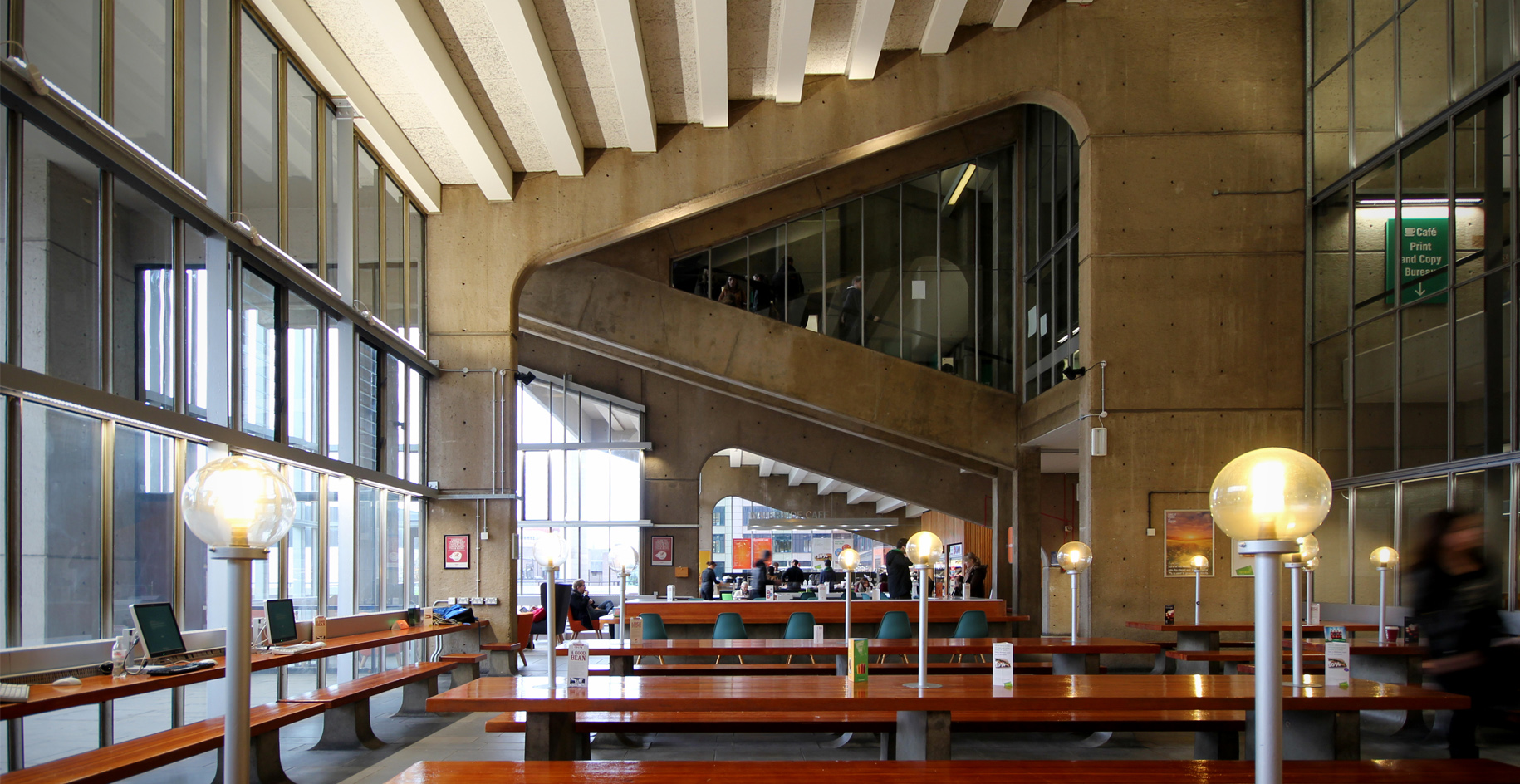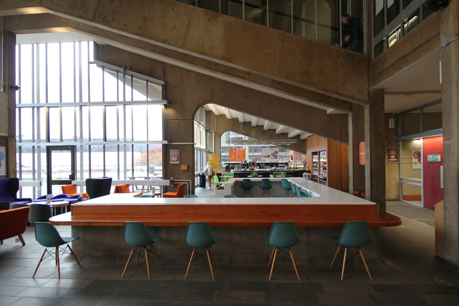 Perhaps the most significant intervention made within the Roger Stevens Building can be seen in the re-working of the building’s cafe at level 6 (lower ground floor level – see below) The cafe inhabits a wonderfully dramatic, double-height volume beneath the one of the main lecture theatres and benefits from continuous, full height glass walls on all sides. The existing cafe had however become extremely cluttered over time, with an unsympathetic central counter housing and smoking room enclosure watering-down the original design concept of a very clear space.