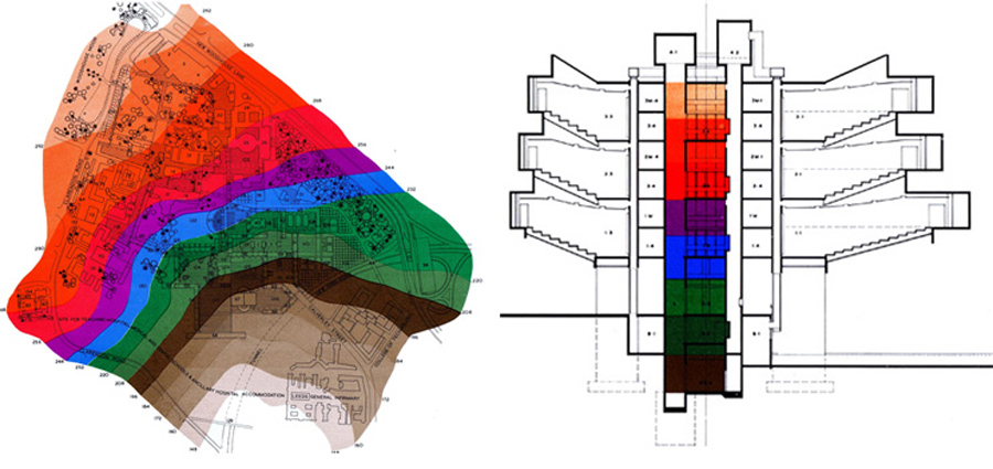 The images above are taken from the 1963 Development Plan Review prepared by Chamberlin Powell & Bon which illustrate the colour-coding device for the campus’s proposed new building levels which was based upon the existing university campus topography. This original thinking regarding colour coding the various levels became central to our proposals for the refurbishment.