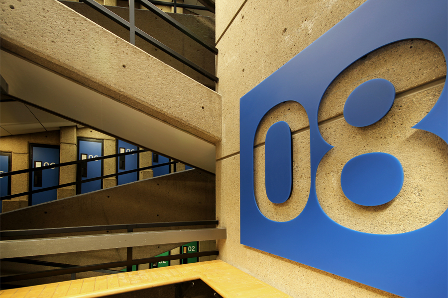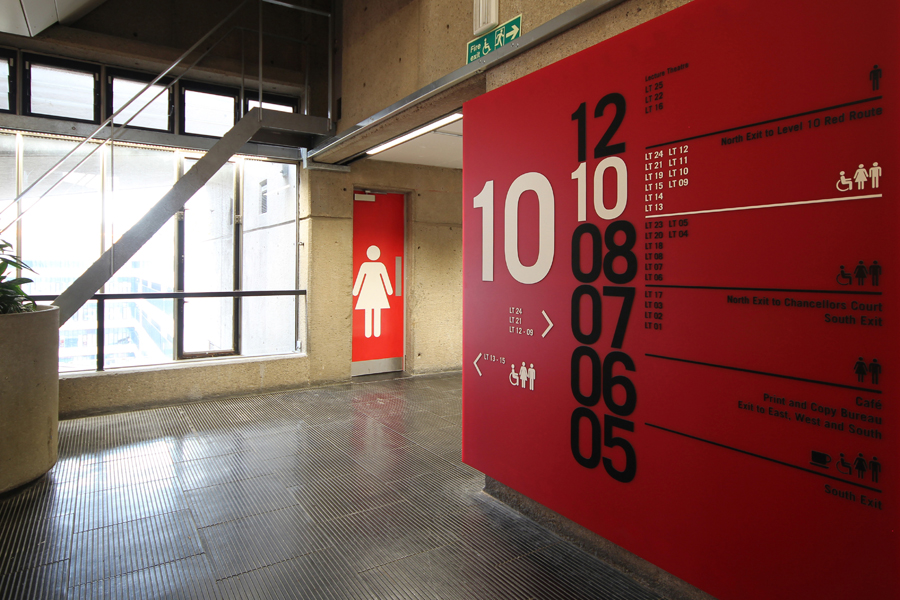 The signage in the building was in desperate need of an overhaul. Being such an unusual building, finding your way around the place for the first time or infrequent visitor was challenging to say the least. Whilst established students and staff eventually became familiar with the building’s layout, for new students, conference goers and other visitors understanding the logic behind the theatre numbering and locations used to take some time. Previous attempts to improve the situation had tended to add to the clutter and to the confusion. A ‘start gain’ approach was required and an ideal solution to the problem was found during our research into the history of the site and the original building design.